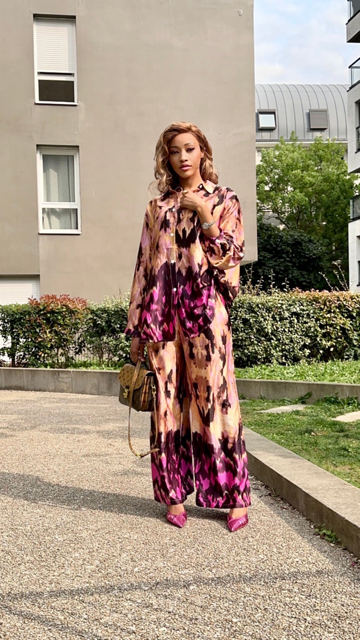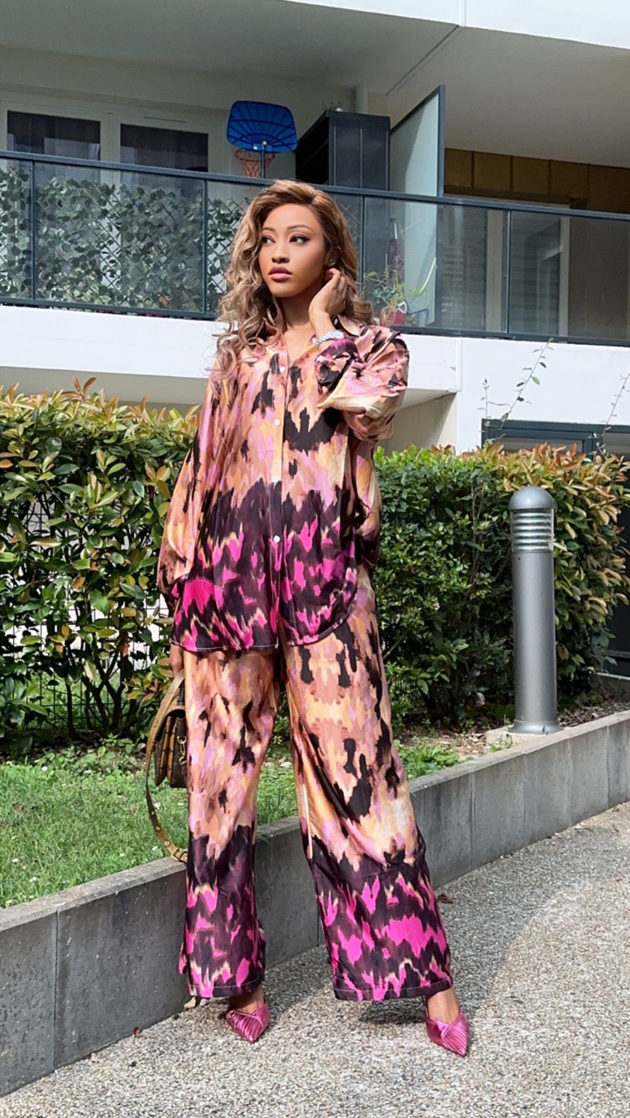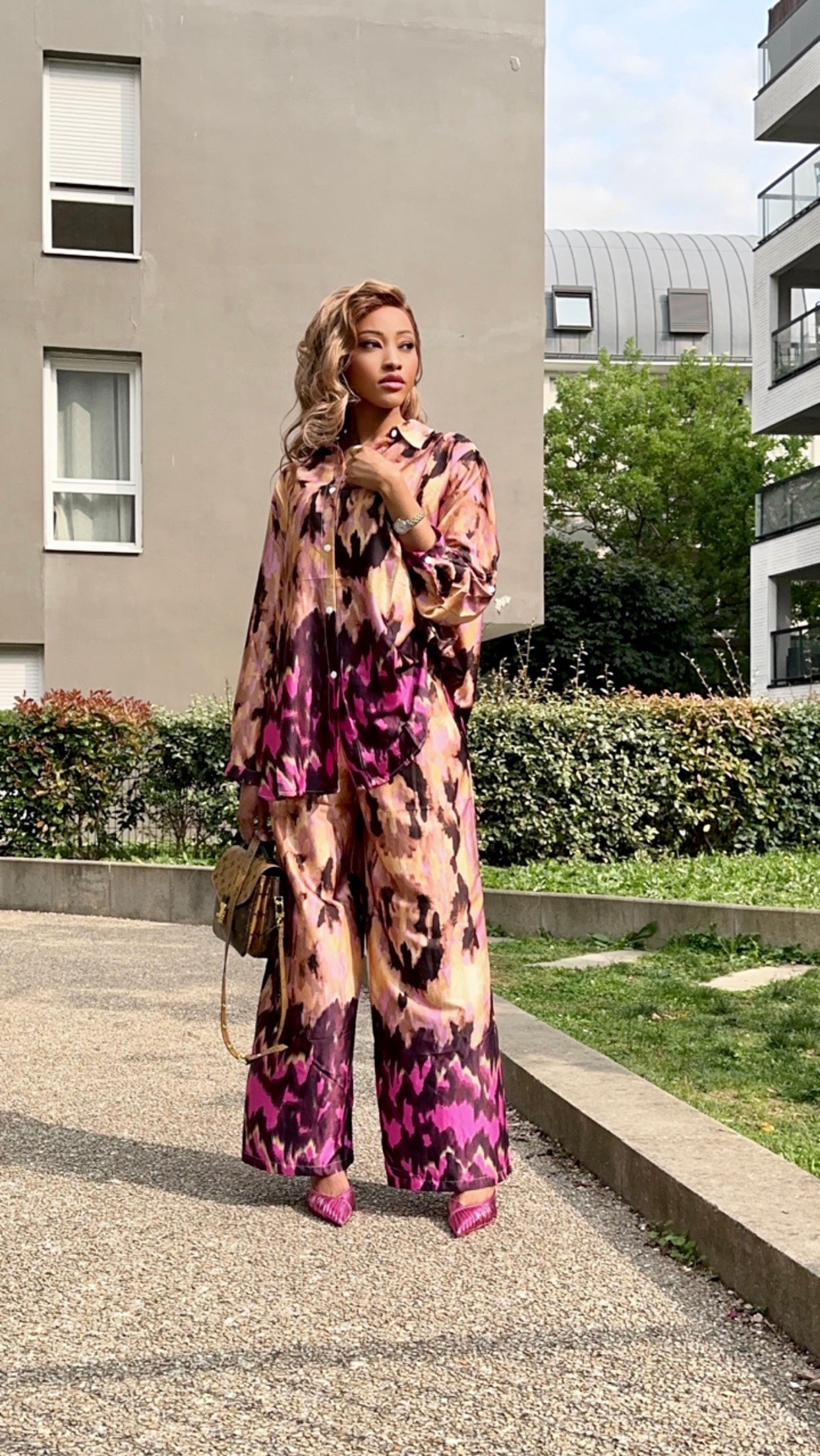 Ensemble florales fluide et léger. La chemise se ferme par des boutons et les manches peuvent être retroussée et attachée par une languette et un bouton sur le haut du bras. Le pantalon long, large et fluide qui se ferme avec un zip et un bouton.