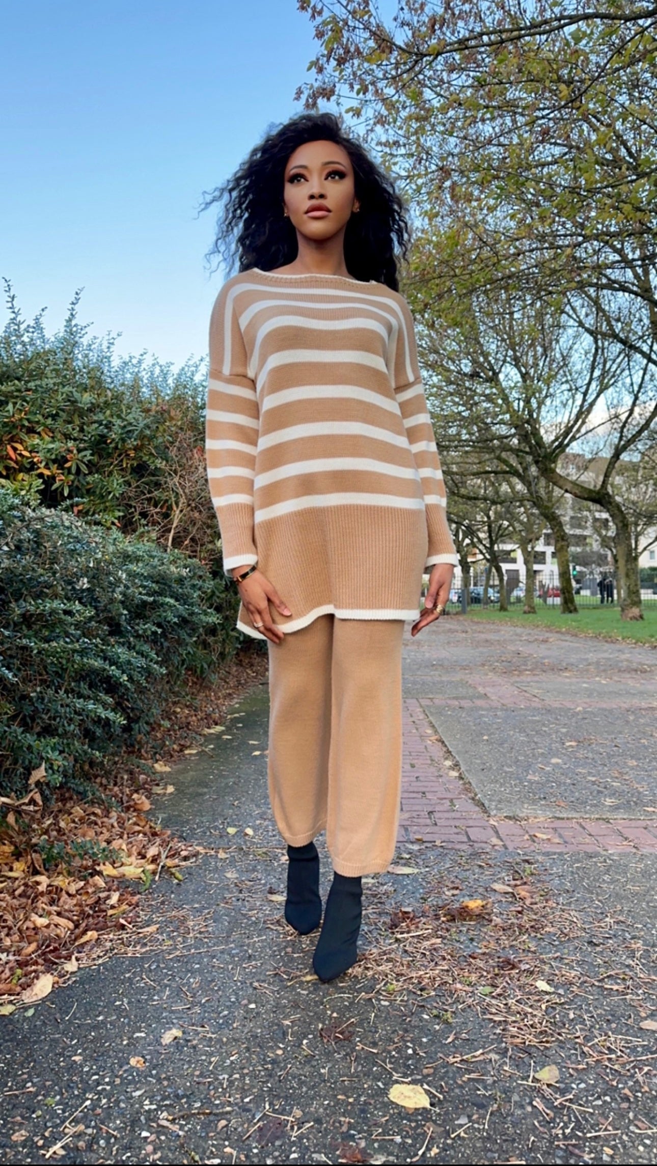Ensemble pull en maille noir à rayures blanches. Pull ample avec deux fentes sur les côtés et un pantalon évasé.