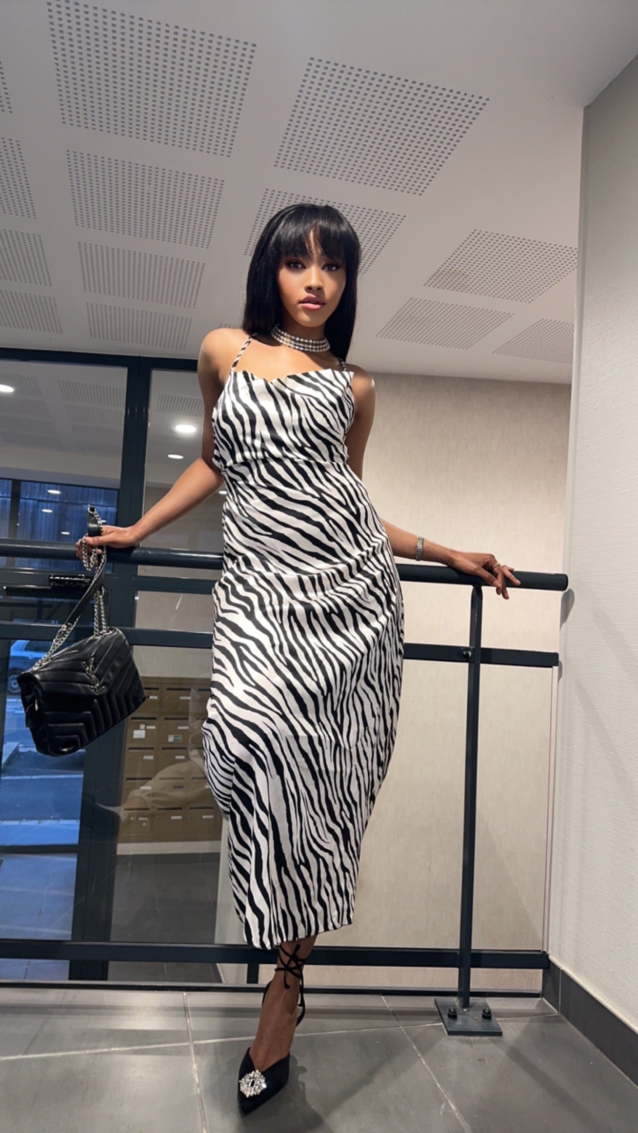 Robe imprimé animalier à bretelles, droite mi-longue et avec des lacets dans le dos.